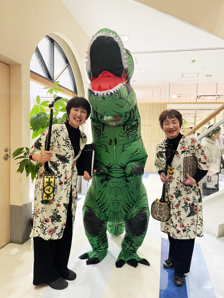 演奏後、JTB山口支店の恐竜さんとともに。